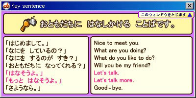 ![]() PlayEnglish2 Let's go with Charpy 英語がはじめての小学生からできる英会話学習ソフトです。 主人公のチャーピー(小鳥)が森に行って、様々な体験をするストーリーのなかで、英会話の基本を自然に学ぶことができます。 |