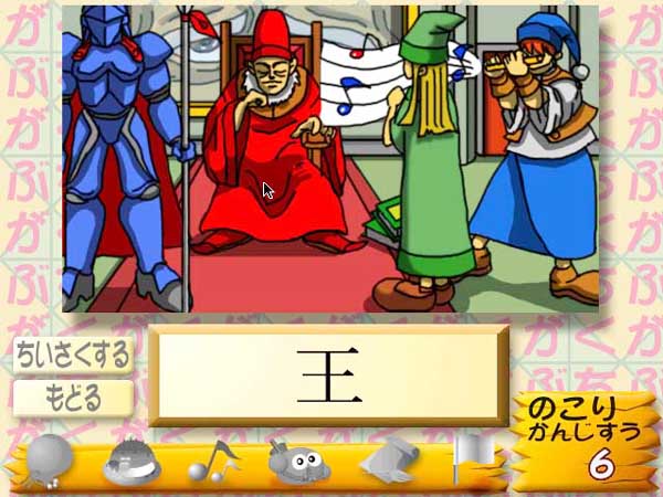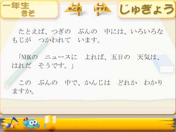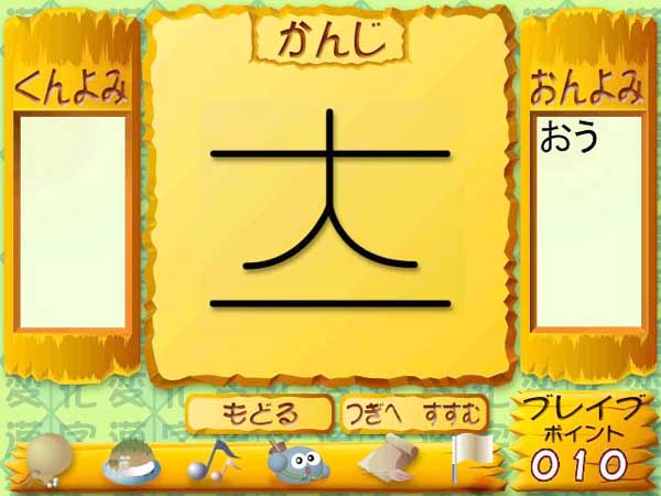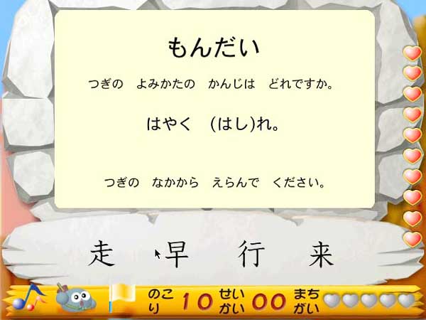 のんびりと海釣りをしながら楽しく学習。 問題に答えながら、たくさんの魚を釣り上げましょう! 答えを間違えたり、リール制御に失敗すると糸が切れるから気をつけてね。このゲームでは2年生の「漢字の読み」を学習します。