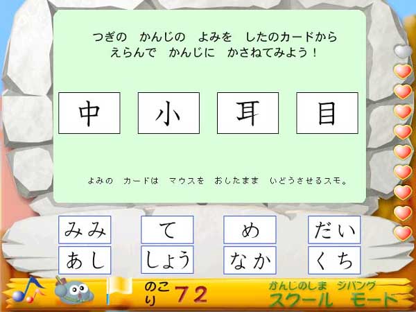 漢字の島ジパングは、小学生1〜3年を対象にした漢字学習ソフトです。 「ストーリーモード」は、光の消えてしまった灯台に、再び光りをともす為に5つの島を冒険するRPG風に仕上がっています。 ジパング学校に行って授業やテストを受けたり、ワークハウスでポイントを貯めながら5つの島を行き来して下さい。ストーリーを省いて学習だけを目的とした「スクールモード」もあります。 学校でお使いになるときは、こちらをどうぞ。