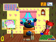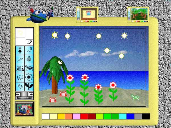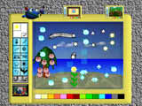部屋の中や海岸、森のキャンパスが用意されています。そこに自分でマウスを使ってお絵描きをします。左クリックをして、マウスを動かして・・・・。コンピュータ学習の初歩には最適の学習素材です。おもしろペンでいろいろなキャラクターをスタンプしよう。 |